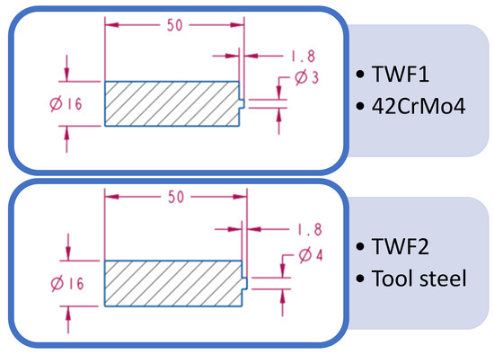 Two different tools were produced—TFW1 and TFW2 (see Figure 2 and Figure 3)—with a cylindrical main body of 16 mm in diameter and a total length of 50 mm, with different pin geometry (see following section for details). The tools were designed to match the thickness of the aluminum sheets, with inexpensive geometry that is straightforward to manufacture. This tool geometry was carefully chosen to effectively stir and consolidate the material of the thin sheets while avoiding excessive heat input or deformation. The tool depth and path were carefully set to maximize material penetration and alignment.