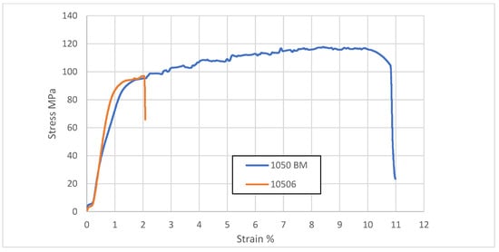 The measured stress–strain curves for the two specimens, 1050 BM and 10506, are shown in Figure 5. The base material AA1050 BM demonstrates considerable tensile strength, reaching approximately 118 MPa, with strain approaching 10%, indicative of excellent ductility. The stress–strain curve within the plastic region reveals a relatively stable stress level (related to the strain hardening effect) across an extensive range of strain, as the material is capable of enduring significant deformation without sudden failure. In contrast, specimen 10506 exhibits a lower maximum stress, nearing 95 MPa, which is markedly inferior to that of the base material. The maximum strain for this specimen is substantially diminished at 2%, reflecting a decrease in ductility compared to 1050 BM.