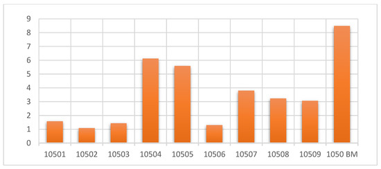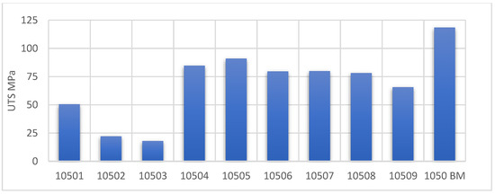 The ultimate tensile strength (UTS) values for various specimens, expressed in MPa, are shown in Figure 6 alongside the base material 1050REF for comparative analysis. The base material exhibits the maximum UTS at approximately 118 MPa, demonstrating its capacity to endure the highest stress prior to failure. Similar results have been reported in the literature [40] on this alloy. Other specimens, namely 10504 and 10505, present moderate UTS values of around 84 MPa and 90 MPa, respectively, indicating a reasonable strength that is, however, significantly lower than that of 10506 and the base material. The specimens with the least tensile strength include 10503 (approximately 18 MPa) and 10502 (approximately 22 MPa), both characterized by exceedingly low tensile strength.
