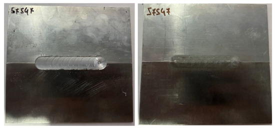All AA5754 specimens were successfully welded with the sole exception of specimen 57541. This failure can be attributed exclusively to the rotational speed of the selected welding tool. Upon visual inspection, all remaining specimens appear to have been effectively welded; however, specimens 57547 (see Figure 8) and 57548 appear visually to be the best joints produced.