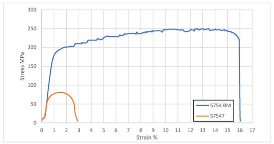 The diagram presented in Figure 9 illustrates the stress–strain characteristics of two aluminum alloy specimens, namely 5754 BM (denoted by the blue curve) and 57547 (represented by the orange curve). The 5754 BM specimen reveals a significantly greater tensile strength, attaining a maximum stress value that approaches 250 MPa. The curve reaches a plateau within the plastic deformation region, where the material undergoes strain hardening, thereby sustaining a high stress level whilst continuing to deform. The material exhibits exceptional ductility, with strain extending to approximately 15%, which signifies its capability to endure significant deformation prior to failure.
