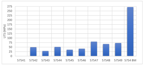 Table 6 presents the mean values of the measured mechanical properties for all specimens: the ultimate tensile strength (UTS in MPa) and elongation (ε% in percentage). The highlighted rows denote the base material AA5754 BM and specimen 57547, which exhibits the highest tensile strength among the welded specimens. The base material, 5754 BM, shows an ultimate tensile strength (UTS) of 271 MPa, which is markedly superior to that of all other specimens. Values close to the ones measured have previously been reported [41]. Additionally, it has the highest elongation (ε%) at 11.5%, signifying exceptional ductility, thereby permitting the material to elongate considerably prior to fracture.