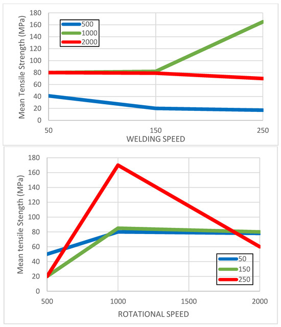 The interaction plot for mean tensile strength (Figure 13) offers a more profound understanding of the interconnection between rotational speed and welding speed, and their combined impact on tensile strength. This plot is pivotal for discerning any synergistic effects that may not be immediately evident when examining the factors in isolation. From the plot, several significant observations are made below.