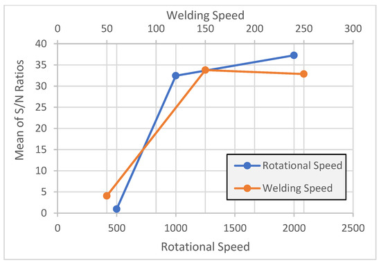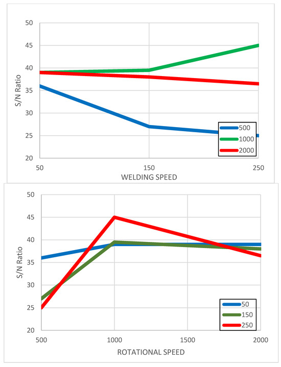 At 500 RPM, the S/N ratio remains consistently low across all welding speeds, reflecting inadequate robustness. This observation suggests that 500 RPM is not only insufficient for generating the necessary heat, but is also highly sensitive to external disturbances, resulting in variable and unreliable outcomes. This reinforces the imperative for higher rotational speeds to attain a more stable welding process.