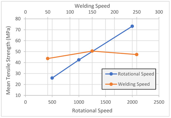 With respect to welding speed, tensile strength remains largely stable within the range of 50 mm/min to 150 mm/min, yet it experiences an increase at 250 mm/min. This observation indicates that elevated welding speeds may enhance material flow and heat dissipation, thereby contributing to superior weld quality. Therefore, the optimal parameter set, as drawn from this plot, consists of a rotational speed of 1000 RPM and a welding speed of 250 mm/min.