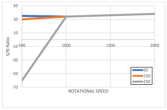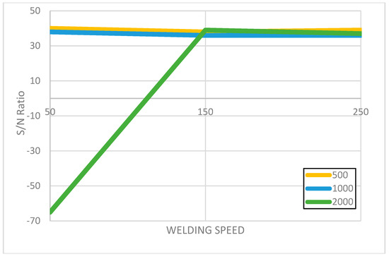 At 500 RPM, the slow welding speed (see Figure 19) exhibits low S/N ratios, indicating significant unpredictability and poor process stability at this rotational speed. The S/N ratios improve at 1000 RPM for 150 mm/min, suggesting greater process stability with these parameters.