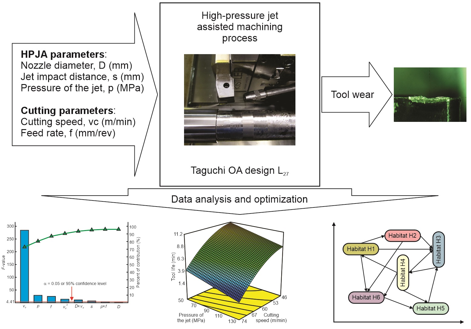 - A mathematical model for tool-life prediction in HPJA machining of Inconel 718 was developed based on RSM. The formulated mathematical model is statistically significant and very useful for prediction purposes.