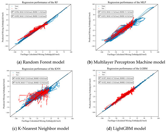 In Figure 2, the scatter points are to the diagonal, the smaller the error between the predicted value and the actual values, indicating stronger predictive performance. As shown in the figure, the LightGBM model outperforms the other three models in terms of regression, achieving an R2 score of 92.2% and an MAE of 3.5 kJ/mol on the test set, demonstrating its excellent predictive performance. The RF algorithm follows as the second-best performer. This suggests that ensemble learning methods offer a clear advantage in fitting the prediction of the enthalpy of mixing, providing better training performance and predictive accuracy. Previous studies [29] have also shown that ensemble learning methods typically yield better results in the machine learning prediction of thermodynamic properties, and the current results are consistent with these findings.