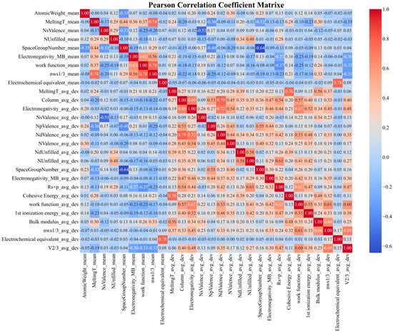 To optimize the performance of the LightGBM model and enhance the interpretability of feature engineering, this study adopted a phased feature selection strategy. First, the initial 56 descriptors were ranked by importance using the Recursive Feature Elimination (RFE) method. By iteratively removing the features with the least contribution to predicting the target attribute, the feature space was reduced from 56 dimensions to 30. This process not only achieved initial dimensionality reduction but also improved model prediction accuracy. Building on this, further feature reduction was performed by identifying two highly correlated descriptor pairs (CohesiveEnergy_mean—MeltingT_mean and CovalentRadius_avg_dev—Rs+p_avg_dev) with a MIC greater than 0.8. Based on the feature importance ranking, one feature from each pair (MeltingT_mean and Rs+p_avg_dev) was retained due to their stronger associations with the target attribute, resulting in a final set of 28 statistically independent key descriptors. To systematically validate the independence of the selected features, the Pearson correlation coefficient matrix among the 28 features was calculated (as shown in Figure 3). The results indicated that the absolute values of the correlation coefficients for all feature pairs were below 0.8 [47], quantitatively confirming the low redundancy of the selected feature set. The red and blue color gradients in the figure represent positive and negative correlations between features, respectively.