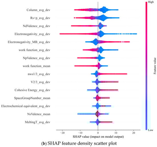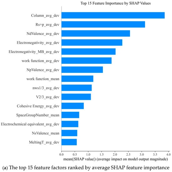 Feature importance analysis shows (Figure 4a) that the contribution of the column sequence average absolute deviation (Column_avg_dev) to the prediction of mixing enthalpy is the highest, followed by the pseudopotential radius average absolute deviation (Rs+p_avg_dev) and electronegativity average absolute deviation (Electronegativity_avg_dev). This finding aligns with traditional physical metallurgy theory in multiple dimensions. In the Miedema model, the electronegativity difference (ΔΦ) is a core parameter that directly affects the strength of chemical bonds. The Hume-Rothery rules [48,49] state that, when the atomic radius difference (Δr) exceeds 15%, the lattice distortion energy increases significantly. The larger the column sequence deviation, the more pronounced these property differences typically are, thus affecting the mixing enthalpy. The machine learning model successfully captures the synergistic effect of these multiple parameters, using the column sequence deviation as a high-order correlation feature, which helps explain the interaction between ΔΦ and Δr and their contribution to the mixing enthalpy. It is worth noting that, among the top 15 important features, 9 physical features constructed based on domain knowledge (accounting for 60%) show significant advantages, indicating that manually selected features based on prior physical knowledge can effectively capture relevant material characteristics while having lower computational costs.