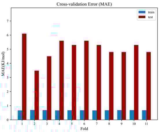 In order to avoid the bias caused by the division of the training and test sets, we adopted a cross-validation method. Specifically, the 583 binary systems were randomly divided into 11 subsets. In each dataset, one subset was selected as the test set, and the remaining 10 subsets were used as the training set. Figure 5 shows the training and testing errors for the 11 training-test dataset pairs. From the figure, it can be seen that the training errors remain almost the same, although there are moderate fluctuations in the testing errors between different dataset pairs. This suggests that the fitting ability of the model is more stable during the training process, while the variation of the testing error may be related to the specific composition of the dataset. Therefore, cross-validation effectively reduces the bias due to differences in data partitioning and enables a more comprehensive assessment of the model’s generalization performance.