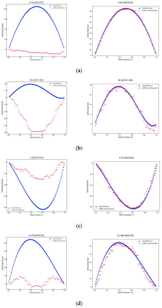 Comparison of prediction results with CALPHAD calculations for different systems on the test set (left) and train set (right), (a) Ir-Ru system (b) Bi-U system (c) Ir-Zr system (d) Cu-Nb system.