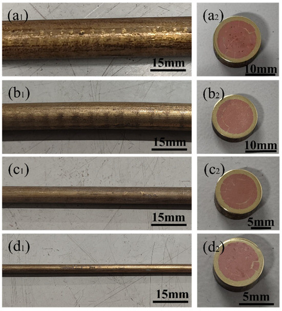 The prepared brass-clad copper stranded wire composites are shown in Figure 2(a1,a2). The composite material consists of pure copper strand wire (comprising 24 outer copper wires and 1 central copper wire) and an external brass cladding layer. The interface between the outer pure copper strand wire and the brass cladding layer is firmly bonded through metallurgical bonding, while the pure copper strand wires are connected to each other through mechanical bonding. The material exhibits excellent surface quality and can be directly subjected to cold drawing processing without the need for acid pickling, polishing, or other treatments. In order to investigate the evolution of the microstructure and properties of the composite material during the drawing process, the drawing process parameters are established as shown in Table 1. The composite material after drawing is shown in Figure 2(b1–d2).
