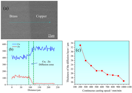 SEM images and diffusion layer thickness statistics of brass-clad copper strand wire composite billet: (a) scanning image of diffusion zone in composite wire; (b) element diffusion map; (c) diffusion layer thickness at different continuous casting speeds.