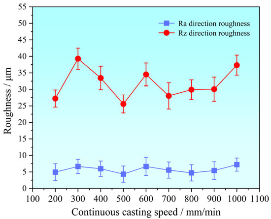 Surface roughness of brass-clad copper strand wire composite billet at different continuous casting speeds.