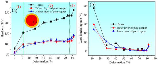 Hardness and work hardening rate of brass and copper strand wire at different drawing deformation amounts: (a) hardness; (b) work hardening rate.