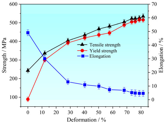 Figure 8 shows the variation trends of tensile strength, yield strength, and elongation after fracture of the brass-clad copper strand wire composites after drawing, as a function of total deformation. The tensile strength of the as-cast composite billet is 243 MPa, with an elongation after fracture of 49.1%. For a total deformation of 0–28.3%, the tensile strength of the composite wire increases almost linearly with increasing deformation, while the elongation after fracture decreases. At 11.9% total deformation, the tensile strength rises to 336 MPa, and the elongation decreases to 30.1%. At 28.3% total deformation, the tensile strength further increases to 404 MPa, and the elongation decreases to 13.1%. For a total deformation of 40.2–68.1%, the increase in tensile strength slows down, and the rate of decrease in elongation after fracture also reduces. At 68.1% total deformation, the tensile strength reaches 504 MPa, and the elongation decreases to 6.7%. For a total deformation of 73.4–81.5%, the tensile strength and elongation after fracture show little variation. At 81.5% total deformation, the tensile strength is 534 MPa, and the elongation after fracture is 4.7%. During the deformation process of the composite wire, both the pure copper stranded core and the brass cladding undergo significant work hardening. This work hardening leads to a linear increase in dislocation density, resulting in a nearly linear increase in the tensile strength of the composite wire with increasing deformation [11,12,13]. Moreover, the constitutive model for the composite is a potential direction for further research.