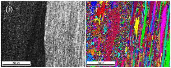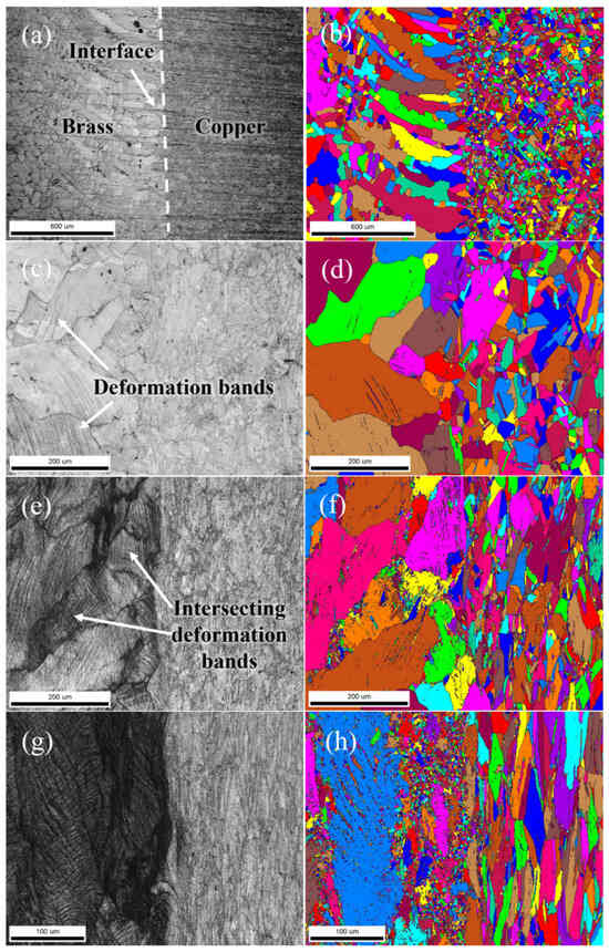 Figure 10 presents the EBSD contrast images and orientation imaging maps of the brass cladding layer and the pure copper strand wires in the longitudinal section of the brass-clad copper strand wire composite material. During the continuous casting and drawing processes, the microstructure of pure copper and brass undergoes significant changes [14,15,16,17]. Figure 10a shows that the brass cladding layer in the composite billet exhibits a columnar grain structure growing along the radial direction, while the pure copper strand wires display equiaxed grains with annealing twins inside some grains. Additionally, the interface between the brass cladding and the pure copper strand wires achieves excellent metallurgical bonding. During the continuous casting composite process, when the high-temperature brass melt comes into contact with the lower-temperature pure copper strand wires, the cooling effect of the pure copper strand wires creates a significant radial temperature gradient. This leads to the rapid solidification of the brass melt on the surface of the copper strand wires and promotes the growth of columnar grains along the radial direction, forming the characteristic radial columnar grain structure in the brass cladding layer. Meanwhile, the intense heating effect of the high-temperature brass melt causes the pure copper strand wires to heat up rapidly. This results in recrystallization and grain growth within the copper strand wires, forming the equiaxed grain structure. Due to the coarse grains and the elevated heating temperature, annealing twins are observed within some grains. During the deformation process, the brass has higher strength and tends to resist more deformation and thus bear higher stress, while the copper experiences relatively lower stress. Thus, stress concentration tends to occur near the interface between the two phases. In terms of strain, the copper undergoes larger plastic deformation, whereas the brass shows less plastic deformation. As a result, micro-displacements may occur at the phase boundaries. The above views need to be further verified by simulation or other methods.