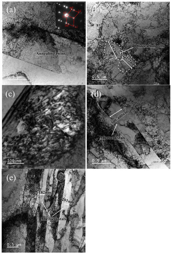 In order to further study the microstructure evolution of brass-coated copper stranded wire composite billets during the drawing process, transmission electron microscopy (TEM) was used to observe the microstructure of the composite billets under various drawing conditions [18,19,20,21,22,23]. Figure 11 shows the TEM microstructure of the pure copper stranded wire in the composite billet. In the as-cast state (Figure 11a), typical annealing twins were observed within the grains of the pure copper stranded wire, along with a few dislocations. These dislocations were caused by the vacancy accumulation generated during the continuous casting process when the pure copper stranded wire was heated by the high-temperature brass melt. When the total drawing strain reached 11.9%, a large number of dislocations appeared in the pure copper wire grains, and dislocation interactions formed dislocation cells with diameters ranging from 350 to 500 nm (Figure 11b) [17,20,21,22]. When the total drawing strain reached 40.2%, the dislocation density in the pure copper stranded wire further increased, and the dislocations became tangled (Figure 11c). At a total drawing strain of 57.7%, elongated microcrystal structures with parallel distribution were observed in the pure copper stranded wire, with microcrystal widths ranging from 300 to 400 nm. These microcrystals contained a high density of dislocations (Figure 11d). When the total drawing strain reached 81.5%, the number of microcrystals in the pure copper stranded wire further increased, and the microcrystal width decreased to 150–250 nm (Figure 11e).