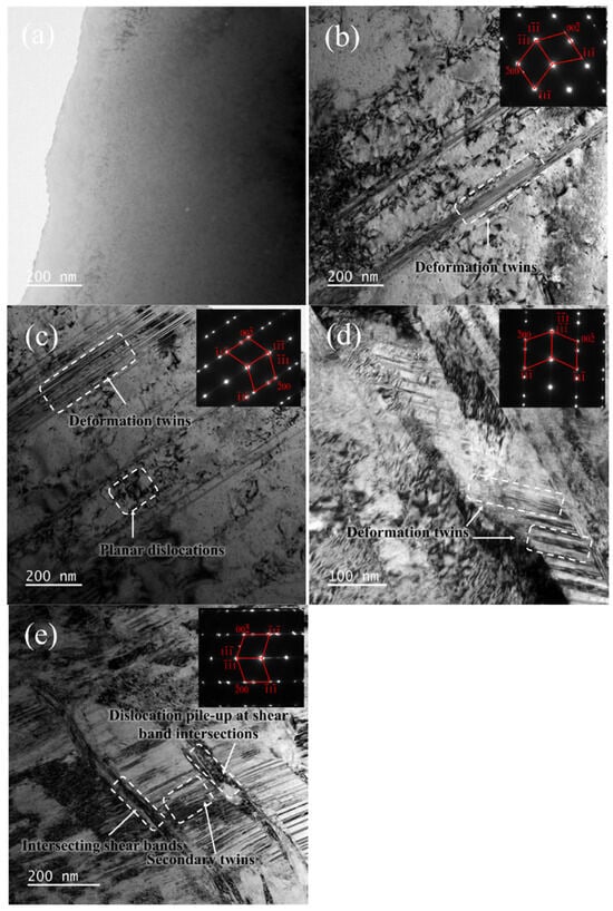 In the as-cast state, the brass coating layer shows a uniform contrast, exhibiting typical microstructure features of the as-cast condition (Figure 12a). When the total drawing strain reached 11.9%, a large number of diffusely distributed dislocation networks were observed in the brass coating, along with the formation of a small amount of deformation twins (Figure 12b). When the total drawing strain reached 40.2%, the number of deformation twins in the brass coating significantly increased, with twin widths around 8.5–10 nm (Figure 12c). At a total drawing strain of 57.7%, the number of deformation twins in the brass coating significantly increased, with their width reduced to 3–5 nm. The intersecting twins caused local lattice distortion to intensify (Figure 12d). Additionally, shear bands with different orientations were observed in the brass coating [20,21,22]. These shear bands intersected and passed through the deformation twins, forming intense shear deformation regions that caused noticeable crystal rotation in the local area [23,24,25,26,27]. Furthermore, high-density dislocation accumulation regions were found at the intersections of the shear bands (Figure 12d), indicating that these intersections were high strain regions. When the total drawing strain reached 81.5%, the number of dislocations and deformation twins in the brass coating significantly increased, with twin widths reduced to 2–4 nm (Figure 12e). The interaction of intersecting shear bands became more prominent, and secondary twins and high-density dislocations were observed within the wider primary twins. The strong interaction between the secondary twins and dislocations suggests that the brass coating has reached a highly deformed state (Figure 12e).