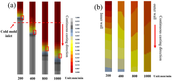 Figure 13a shows the simulated temperature field of the brass cladding layer during the solidification process, while Figure 13b provides a magnified view of the longitudinal cross-sectional region from the inner wall to the outer wall, corresponding to the red boxed area in Figure 13a. It can be observed that as the casting speed increases from 200 mm/min to 1000 mm/min, the solid–liquid interface progressively moves deeper into the cold mold section. The further the solid–liquid interface enters the cold mold section, the more significant the cooling effect of the cold mold on the brass melt becomes. At casting speeds of 200–400 mm/min, the solid–liquid interface is located in the upper part of the cold mold section. In this case, the temperature of the inner side of the casting sample decreases rapidly, and the cooling effect of the pure copper strand wires dominates. This leads to the brass melt near the pure copper strand wires solidifying first. At casting speeds of 800–1000 mm/min, the solid–liquid interface has fully entered the cold mold section. At this stage, the temperature on the cold mold side decreases more rapidly, and the cooling effect of the cold mold surpasses that of the pure copper strand wires. Due to the combined cooling effect of the cold mold and the pure copper strand wires, a mixed grain structure forms in the region near the outer wall of the brass cladding layer.