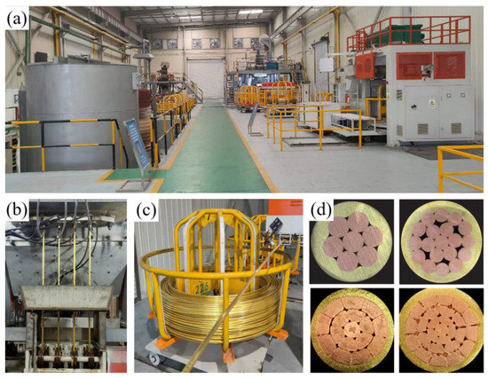(a) Overall view of composite wire production line; (b) multi-flow continuous composite casting equipment; (c) composite wire product after drawing; (d) cross-sections of serialized brass-clad copper stranded wire composites.