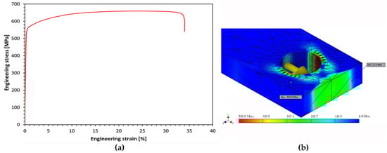 Figure 2a shows the stress-strain behavior of the material, observed during the tensile tests. A yield stress of ~550 MPa is observed, as well as a Young’s modulus of ~191 GPa (evaluated in the range of 150–450 MPa). A preliminary analysis by finite elements showed that the maximum load that can be applied to the samples in a pin-hole configuration, to avoid plastic yielding around the holes in the samples during the HENM tests, is around 5750 N—see Figure 2b. Based on this analysis, the maximum load selected to carry out the HENM tests was 5500 N.