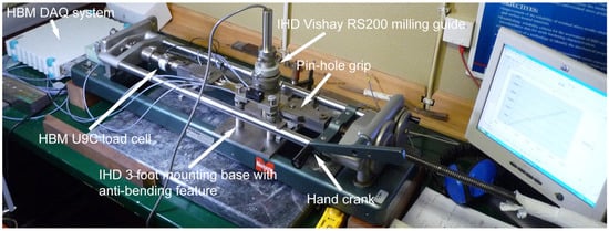 For the minimum load, a load equal to 1000 N was selected. Consequently, a differential load of 4500 N was used in the HENM tests, corresponding to a calibration stress equal to ~56 MPa. The experimental tests were conducted using a manual horizontal tensile test machine, as the experimental setup in Figure 3 shows. The applied load was controlled using an HBM U9C load cell (Hottinger Brüel & Kjær GmbH, Darmstadt, Germany).