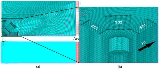 (a) FEM mesh and constraints (top and front view). (b) Mesh amplification near the 1.8 mm diameter hole showing the paths which represent the strain gauge grids (1 mm depth).