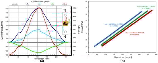Preliminary tests to verify stress-strain behavior were carried out. The real-time graph in Figure 5a shows, as an example, the load (red line) and strain signals recorded during the loading and unloading of an SLM AISI 316L specimen from 0 to 5500 N (as a function of time). The behavior presented in Figure 5a is observed in all performed tests and samples. Strain gauge 1 (dark blue line-SG1) was aligned with the direction of the applied load, while strain gauge 3 (green line—SG3) was aligned at 90° from the load direction, measuring Poisson’s effect only. Strain gauge 2 (light blue line—SG2) was aligned at 45° from the load direction, presenting a signal between the other two strain gauges. Using the load and the microstrain readings from strain gauge 1, a linear behavior between load and strain is observed, as presented in Figure 5b.