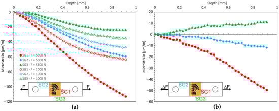 As an example, Figure 6a presents the radial strain reliefs, measured at the surface by the three strain gauges of the ASTM type A standard rosette, as a function of the hole depth, in one of the samples when it is axially loaded at 1000 N and 5500 N, respectively. These values consider the superimposed effect of the applied load and the existing residual stresses. Following the method explained in Section 2 and taking the difference between both cases, it is possible to obtain the strain relaxation as a function of the depth corresponding to the calibration load of 4500 N, as presented in Figure 6b.