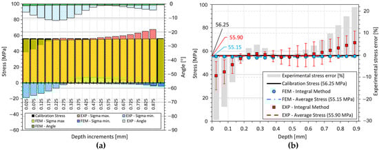 The relative error associated with the maximum principal stress determination by IHD simulation by FEM, using the integral method, is below 2%, which is acceptable. The angle between the maximum principal stress and the direction of strain gauge 1, oriented with the load direction, is near zero, as expected, and the value of the minimum principal stress is negligible, only presenting negative values for the deepest hole depth (maximum of ~−4 MPa at the limit evaluation depth). Regarding the experimental results, the maximum principal stress presents lower values than expected near the surface, while the value for the deeper depth increments is greater than expected. However, in between, the experimental results agree well with the expected value (stress calibration value). Minimum principal stress oscillates around zero, varying between −18 MPa and +7 MPa. The angle between the maximum principal stress and the direction of the applied load deviates by a maximum of ~11° at the 5th depth increment. For the sake of clarity, Figure 8b presents a comparison between the calibration stress and the maximum principal stress experimentally and numerically determined.