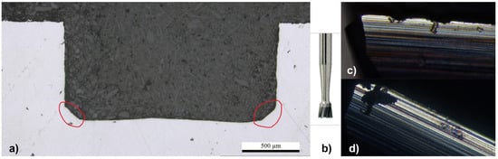 A close investigation into possible causes for such differences, however, seems to point out a geometrical effect instead of possible thermomechanical effects. In fact, the experimental tests were carried out using commercially available end mills, which usually present chamfers. Figure 9a shows a micrograph of a performed hole, showing the bottom hole chamfer, and Figure 9b shows the end mill used. Figure 9c,d show some issues found on the end mill blades during hole-drilling. The end mills are never reused.