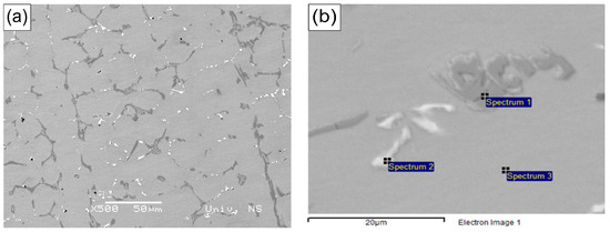 Microstructure of the HP40Nb alloy as cast. (a) SEM (BSE) microscopy at low magnification (500×); (b) SEM-EDS (BSE) image at high magnification (2000×).