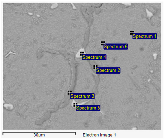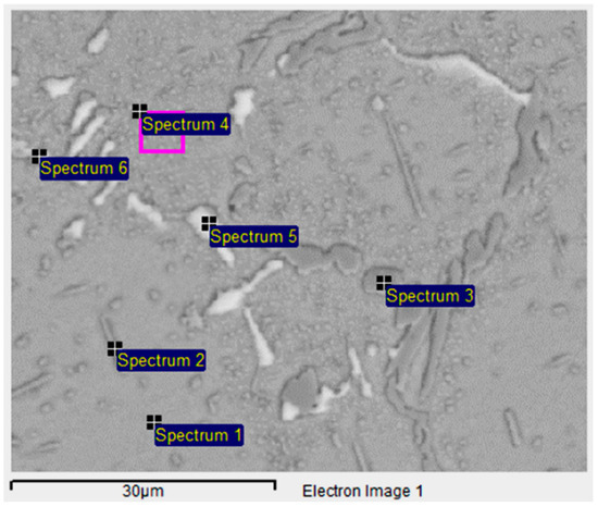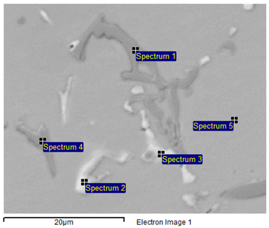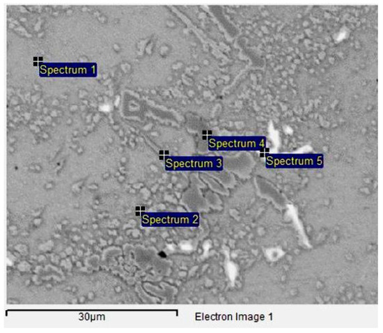 Figure 11 illustrates that the microstructure experienced significant changes after overheating at 950 °C, while Table 5 presents the EDS analysis results of the phases in the sample treated at 950 °C for 2 h, as observed in the SEM micrograph in Figure 11.