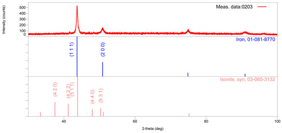 The X-ray phase analysis (X-ray powder diffraction—XRPD) was performed on powdered samples with the help of a Smartlab powder diffractometer (Rigaku, Tokyo, Japan). Radiation from the copper anticathode CuKα12 was used. The operating voltage on the tube was U = 40 kV, and the current was I = 30 mA. The electrolytic method of anodic extraction, successfully tested in the extraction of carbides and intermetallic phases from the matrix of different superalloys [33], was applied in this case. The electrolyte was a mixture of 94 vol% ethanol and 6 vol% HCl. The current during dissolution was 120 mA (the current density was about 0.2 A/cm2) between the sample and titanium wire, which was also submerged in the electrolyte and served as a cathode. The sample of parallelepiped dimensions 15 × 12.5 × 6.35 mm, previously polished, was embedded in a bath of the appropriate solution and constituted the anode.