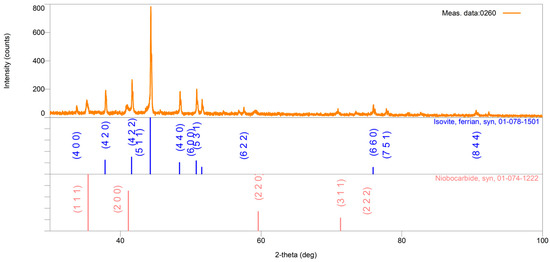 Figure 5 displays the XRPD pattern obtained from the reformer tube sample after being overheated at 950 °C for 8 h. In the reformer tube sample, the following crystal phases are identified: Cr18.93Fe4.07C6, whose diffraction pattern corresponds to the standard PDF#, and 01-078-1501 NbC, whose diffraction pattern corresponds to the standard PDF# 01-074-1222 (PDF-2 Release 2016 RDB) (Figure 5). The results of the submitted chemical analysis indicate the possibility of multiple atomic replacements in the abovementioned crystal structures.