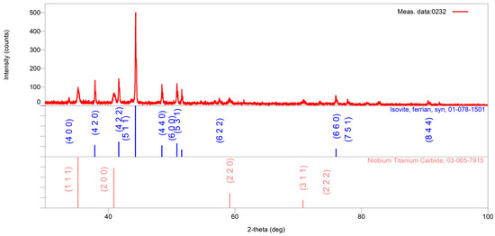 The X-ray powder diffraction pattern of the sample heat-treated at 1050 °C for 8 h is shown in red. Standard reflection positions and intensities for the identified crystalline phases, obtained from the PDF database, are indicated by vertical lines in the lower part of the figure along with their corresponding card numbers. Reflections for Cr18.93Fe4.07C6 are displayed in blue (top row), while those for Nb0.9Ti1.1C2 are shown in pink (bottom row).