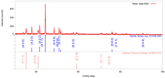 The X-ray powder pattern of the 1050 °C/2 h sample is shown in red. In the lower part of the graphic, vertical lines show the positions and intensities of the standard reflections of the abovementioned crystal phases (taken from the PDF database) and the numbers of the corresponding cards. In the first row, the positions and intensities of Cr18.93Fe4.07C6 reflections are shown in blue; in the second row, the positions and intensities of Nb0.9Ti1.1C2 reflections are shown in pink.