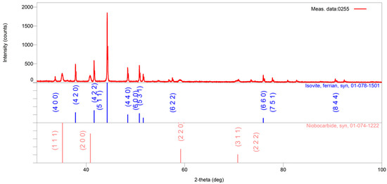The X-ray powder pattern of the 1150 °C/2 h sample is shown in red. In the lower part of the graphic, vertical lines show the positions and intensities of the standard reflections of the abovementioned crystal phases (taken from the PDF database) and the numbers of the corresponding cards. In the first row, the positions and intensities of Cr18.93Fe4.07C6 reflections are shown in blue; in the second row, the positions and intensities of NbC reflections are shown in pink.