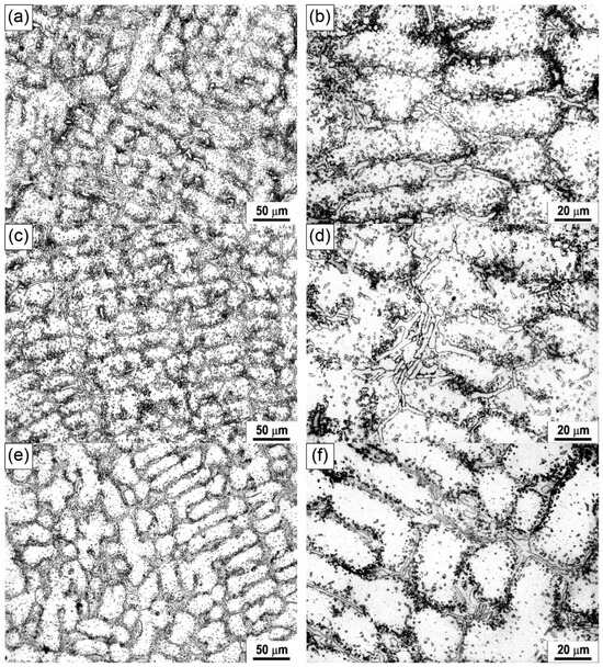 Light micrographs of the HP40Nb alloy after being overheated at (a,b) 950 °C, (c,d) 1050 °C and (e,f) 1150 °C for 2 h.