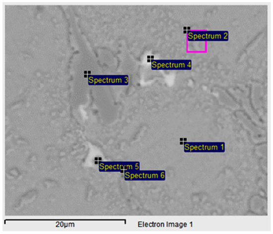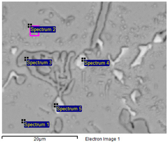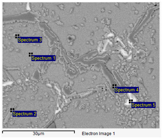 Table 8 provides the EDS analysis results of the phases in the sample treated at 950 °C for 8 h, as observed in the SEM micrograph in Figure 15.
