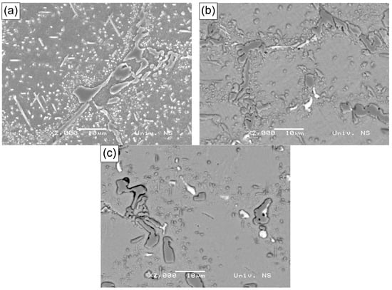 After exposure for 8 h at 1050 °C (high temperature), secondary chromium carbides precipitate inside the grains (Figure 14b). The appearance of needles (carbides), indicating carbides (dark gray) with gray edges, white carbides, and small gray carbides at the base, can be noticed in Figure 14c. Fewer secondary carbides are present, and these have solidified. The change in the carbide contents can be attributed to the dynamic equilibrium between the dissolution and growth of carbides and the carbon diffusion.