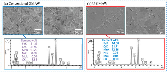 - The combined results demonstrate that ultrasonic-assisted GMAW-AM provides a novel approach for regulating nitrogen behavior in high-nitrogen steel additive manufacturing. By effectively suppressing nitrogen evaporation, this technique enhances nitrogen retention, refines the solidification microstructure, and improves mechanical performance. The underlying mechanism offers theoretical support for process–microstructure control and mechanical property improvement in arc-based additive manufacturing of nitrogen-rich steels.