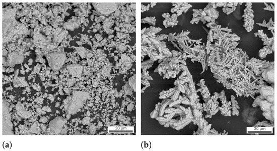 This study used commercial Ti3SiC2 powder produced in Wuhan Golden Wing Industry (Wuhan, China) with a purity of 98% and d50 = 10 µm, d90 = 20 µm (Figure 1a), and copper (PCEP, Ekaterinburg, Russia) with a purity of 99.9% and d50 = 60 µm, d90 = 100 µm (Figure 1b). A commercial polymer binder, MC-2162 (Emery Oleochemicals, Germany), consisting of several components, was used for the feedstock. The feedstock had a Ti3SiC2:Cu ratio of 50:50 (vol.%), and a powder:polymer ratio of 60:40.