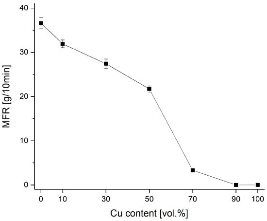 The goal was to obtain the densest samples with the highest copper content. The highest copper content is necessary to ensure the best electrical properties of the materials. High sample density is achieved with the highest density of the printed green samples. In turn, green samples with the highest density can only be obtained with good feedstock flowability—the MFR (melt flow rate) of the material must be at least 15 g/10 min. When using a feedstock with a lower MFR, the printing process is unstable, which leads to the appearance of a large number of macro defects. The flowability of the feedstock was measured depending on the Cu:Ti3SiC2 ratio in the samples (Figure 3). It was found that as the copper content in the mixture increases, the MFR monotonically decreases, and after reaching a 50:50 ratio, the MFR drops sharply. Feedstock with pure copper has zero flowability. The main reason for the low flowability of pure copper is the complex particle shape and the presence of particle agglomerates. A composition with a 50:50 ratio and an MFR of 21.7 ± 1.2 g/10 s was chosen for sample production.