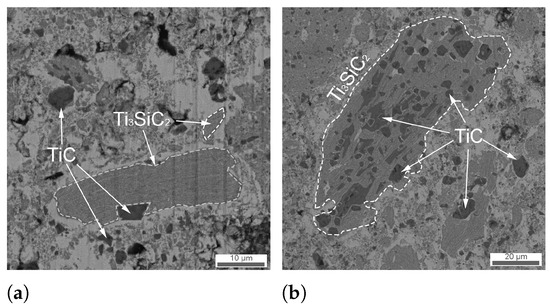 The bulk samples formed a structure with a copper matrix, Ti3SiC2, and TiC inclusions (Figure 5a). Titanium carbide is detected in the original Ti3SiC2 powders, but in situ XRD also shows an increase in TiC content due to partial decomposition of the MAX phase. Titanium carbide, as a decomposition product, is incorporated into the Ti3SiC2 particles, while the original TiC is located in the copper matrix separately from the Ti3SiC2 particles (Figure 5b).