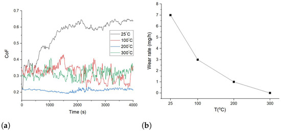 Change in the coefficient of friction during testing (a) and wear rate (b) depending on temperature.