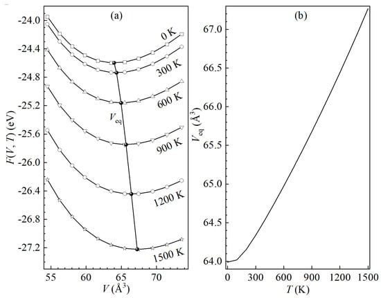 The FPC was conducted using the Vienna ab initio simulation package (VASP) based on density functional theory (DFT) [19,20,21] employing pseudopotentials generated by the projector augmented plane wave (PAW) method [22,23]. The generalized gradient approximation (GGA) with the Perdew–Burke–Ernzerhof (PBE) potential function was utilized to describe the exchange-correlation effects [24]. A cutoff energy of 550 eV was established, and total energy convergence was eV in the electronic self-consistent loop. The Brillouin zone was sampled using the Monkhorst–Pack method [25]. An k-point mesh was employed for the unit cell. Accurate calculations of the total energy and electronic DOS at 0 K were performed for and using the linear tetrahedron method with Blöchl corrections [26]. For the , the Brillouin zone was sampled using Monkhorst–Pack k-point grids for all supercell models. Phonon calculations were conducted using the supercell approach, as implemented in the PHONOPY package, which serves as an interface to the VASP [27]. A 32-atom supercell comprising unit cells and an k-point mesh were employed for the calculations. Force constants were computed using density functional perturbation theory (DFPT), as implemented in VASP [19,20,21], and subsequently post-processed by PHONOPY [27]. During the DFPT calculations, total energy convergence was achieved to within eV in the electronic self-consistent loop. The phonon spectra for are obtained using the PHONOPY package based on the computed force constants. Additionally, PHONOPY was employed to obtain and other thermodynamic properties. and have been calculated at eleven different volumes. The equilibrium volume at any given temperature is determined by fitting the versus V data points with Vinet equation of state (EOS) [28]. The relations between and V for -TiAl at varying temperatures are illustrated in Figure 1a, showcasing the equilibrium volume at a specific temperature denoted by the solid ball. The evolution of the equilibrium volume with T is depicted in Figure 1b, indicating the thermal expansion of -TiAl attributed to the rise in its equilibrium volume with increasing temperature.