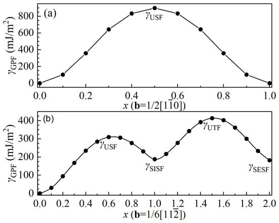 Generalized planar fault energies of (a) 1/2[10](111) and (b) 1/6[11](111) slip systems in -TiAl at 0 K. Where, , , , and denote unstable stacking fault energy, superlattice intrinsic stacking fault energy, unstable twinning fault energy, and superlattice extrinsic stacking fault energy, respectively.